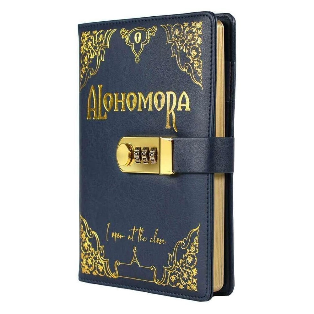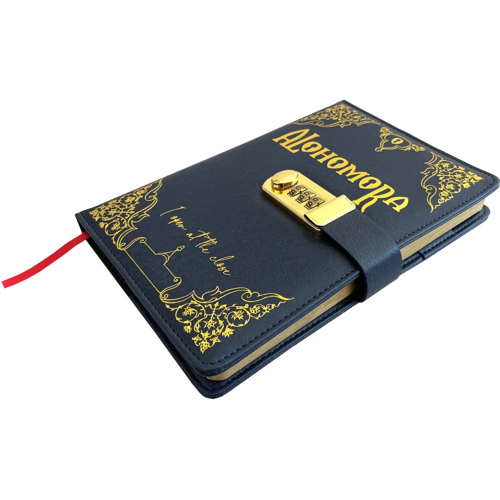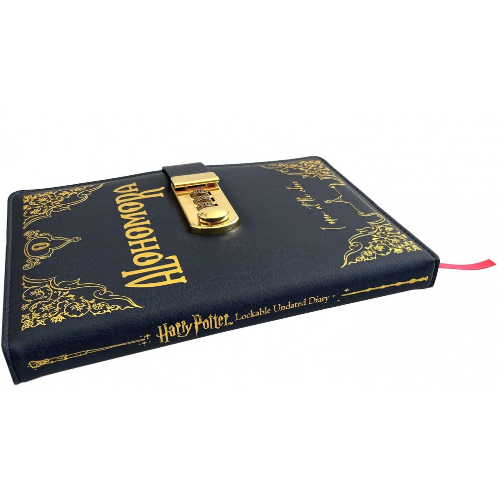 Pěkný linkovaný zápisník pro fanoušky Harry Pottera v deskách z umělé kůže má číselný zámek, který neodemkne ani odemykací kouzlo Alohomora. Zápisník má na horním okraj stránek dny a měsíce k zaškrtnutí, ideálně tedy poslouží jako deník či diář. Jednoznačně potěší detaily jako zlaté zdobení obálky i okrajů stránek a všitá stužková záložka.