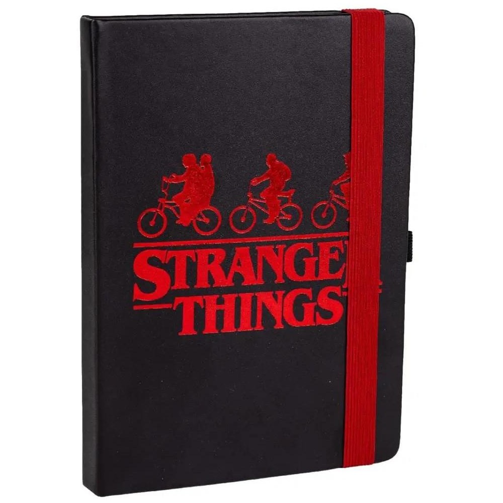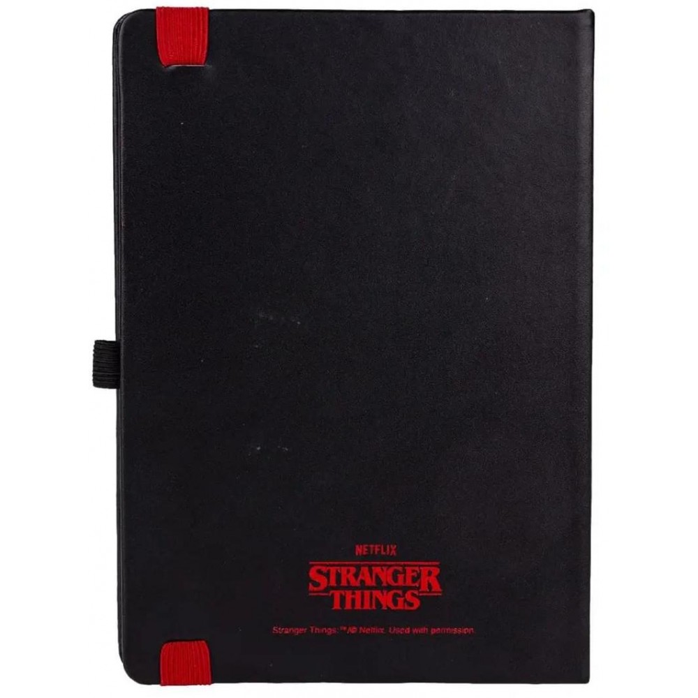 Zápisník v černých deskách z umělé kůže a krásným raženým logem seriálu pro fanoušky Stranger Things - to správné místo pro vaše nápady, poznámky nebo obrázek Demogorgona. Zápisník je linkovaný, má na boku pružné poutko na propisku a zavírá se pomocí červené gumičky.