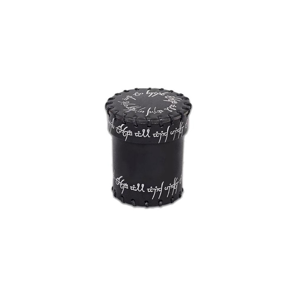 Kožený kelímek na kostky s víčkem, vyrobený ze 4 mm hrubé kůže obarvené na černo, velikost 7x8 cm. Je zdoben stříbrným elfským písmem známým z Tolkienova Pána prstenů. Písmo je do kůže vyraženo a stříbrně nabarveno, takže vydrží mnohé zacházení! Kelímek je skvělý kupříkladu pro dokreslení atmosféry při hraní her na hrdiny.